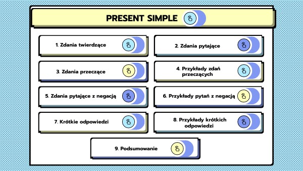 PAMIĘTAJ czasu Present Simple użyjesz kiedy chcesz powiedzieć, że coś w twoim życiu jest stałe bądz dzieje się z jakąś powtarzalnością. Nie możesz użyć tego czasu, jeśli chcesz opisać czynność, która dzieje się TERAZ !!!