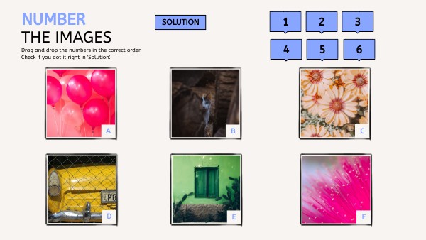 Drag and drop the numbers in the correct order.Check if you got it right in 'Solution'.