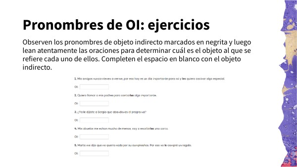 Observen los pronombres de objeto indirecto marcados en negrita y luego lean atentamente las oraciones para determinar cuál es el objeto al que se refiere cada uno de ellos. Completen el espacio en blanco con el objeto indirecto.