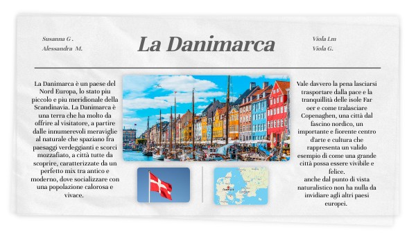 La Danimarca è un paese del Nord Europa, lo stato piu piccolo e piu meridionale della Scandinavia. La Danimarca è una terra che ha molto da offrire al visitatore, a partire dalle innumerevoli meraviglie al naturale che spaziano fra paesaggi verdeggianti e scorci mozzafiato, a città tutte da scoprire, caratterizzate da un perfetto mix tra antico e moderno, dove socializzare con una popolazione calorosa e vivace.