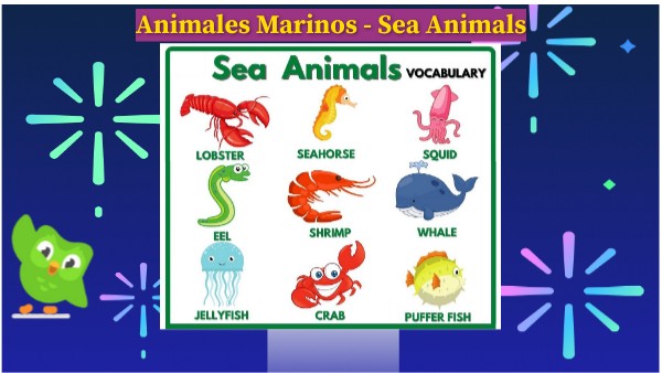 Sea Animals Langosta: Lobster (loster) Caballito de mar: Seahorse (sijors) Calamar: Squid (eskuid) Anguila: Eel (il) Camarón: Shrimp (esrimp) Medusa: Jellyfish (yelifish) Cangrejo: Crab (crab) Pufferfish: Pez globo (puferfish)