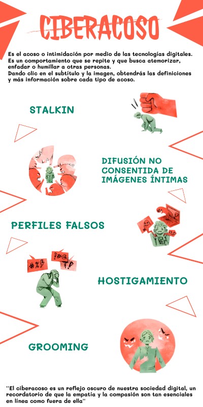 Es el acoso o intimidación por medio de las tecnologías digitales. Es un comportamiento que se repite y que busca atemorizar, enfadar o humillar a otras personas. Dando clic en el subtítulo y la imagen, obtendrás las definiciones y más información sobre cada tipo de acoso.