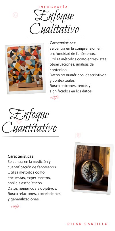 Características: Se centra en la comprensión en profundidad de fenómenos. Utiliza métodos como entrevistas, observaciones, análisis de contenido. Datos no numéricos, descriptivos y contextuales. Busca patrones, temas y significados en los datos.