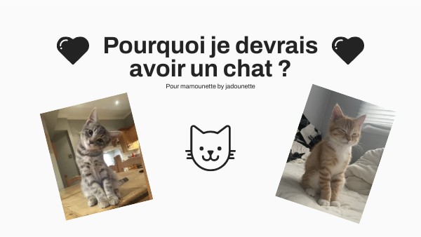 Comme on dit, toutes les bonnes choses ont une fin et c'est sur ça que s'arrête mon diapo sur lequel j'ai quand même passé 2h (applaudissez moi) Je mets ici les sources que j'ai utilisé notamment pour les bienfaits et le budget si tu veux aller voir ça plus en détail :) Sources ; https://www.zooplus.fr/magazine/chat/adopter-un-chat/pourquoi-les-chats-sont-bons-pour-la-sante#:~:text=6.-,Les%20chats%20font%20de%20tr%C3%A8s%20bons%20th%C3%A9rapeutes,les%20enfants%20atteints%20de%20TDA. https://www.dalma.co/blog/combien-coute-un-chat#:~:text=Nourrir%20votre%20chat%20peut%20vous,et%20200%E2%82%AC%20par%20an.