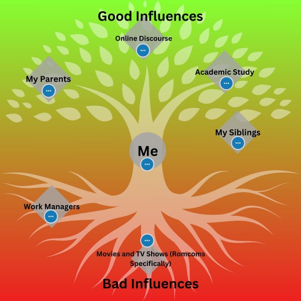 This is everyone's worst influence, right? Even if it's not THE worst influence, it's gotta be pretty far down on the "bad" influences list. I called out RomComs specifically, because one of the worst tropes it tends to use is mind reading. This is where one love interest sees the other doing something that looks harmful, but is completely out of context. Instead of talking with each other about what happened, they both try to read each others minds and assume that the other is thinking one thing when the opposite is true. The other trope I picked up bad habits from media is saying really harmful, shallow things - media teaches us that exploiting a person's weaknesses is the fastest way to get more power in a conflict, and often times that means throwing that weakness in a person's face. This is super damaging to relationships, and is something that I try to avoid, even though it's SO EASY to take advantage of.
