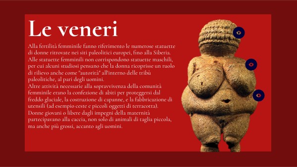 Alla fertilità femminile fanno riferimento le numerose statuette di donne ritrovate nei siti paleolitici europei, fino alla Siberia. Alle statuette femminili non corrispondono statuette maschili, per cui alcuni studiosi pensano che la donna ricoprisse un ruolo di rilievo anche come "autorità" all'interno delle tribù paleolitiche, al pari degli uomini. Altre attività necessarie alla sopravvivenza della comunità femminile erano la confezione di abiti per proteggersi dal freddo glaciale, la costruzione di capanne, e la fabbricazione di utensili (ad esempio ceste e piccoli oggetti di terracotta). Donne giovani o libere dagli impegni della maternità partecipavano alla caccia, non solo di animali di taglia piccola, ma anche più grossi, accanto agli uomini.