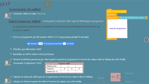 - Calculer la vitesse moyenne du mBot et inscrire les valeurs sur votre feuille