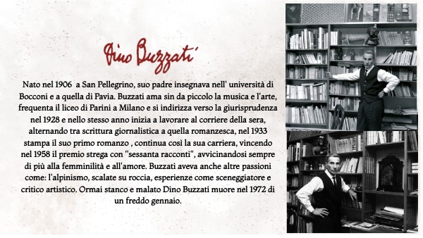 Nato nel 1906 a San Pellegrino, suo padre insegnava nell' università di Bocconi e a quella di Pavia. Buzzati ama sin da piccolo la musica e l'arte, frequenta il liceo di Parini a Milano e si indirizza verso la giurisprudenza nel 1928 e nello stesso anno inizia a lavorare al corriere della sera, alternando tra scrittura giornalistica a quella romanzesca, nel 1933 stampa il suo primo romanzo , continua così la sua carriera, vincendo nel 1958 il premio strega con ''sessanta racconti'', avvicinandosi sempre di più alla femminilità e all'amore. Buzzati aveva anche altre passioni come: l'alpinismo, scalate su roccia, esperienze come sceneggiatore e fu anche critico artistico. Ormai stanco e malato Dino Buzzati muore nel 1972 di un freddo gennaio.