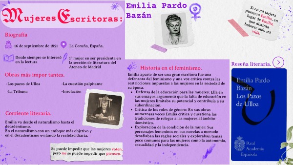 Emilia aparte de ser una gran escritora fue una defensora del feminismo y una voz crítica contra las restricciones impuestas a las mujeres en la sociedad de su época.
