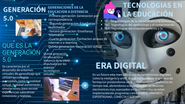 En un futuro esta marcado el uso de herramientas digitales como la inteligencia artifical que nos ayuda en el proceso de formacion prestandonos un acompañamiento sincronico en tiempo real, abriendonos a la posibilidad de recursos electronicos mas avanzados en la universidas se estan implementando programas como DOBOT, UNADBOT, EXPERTAUNAD, CONECTA Y SOPHIA