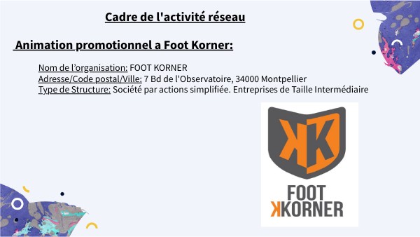 Nom de l’organisation: FOOT KORNER Adresse/Code postal/Ville: 7 Bd de l'Observatoire, 34000 Montpellier Type de Structure: Société par actions simplifiée. Entreprises de Taille Intermédiaire