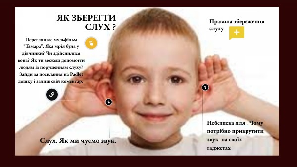 Перегляньте мульфільм "Тамара". Яка мрія була у дівчинки? Чи здійснилпся вона? Як ти можеш допомогти людям із порушенням слуху?Зайди за посилання на Padlet дошку і залиш свій коментар.