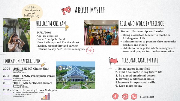 24/12/2001 Age, 22 years old Come from Ipoh, Perak. Have 4 siblings and I'm the eldest. Passion, responbility and carring Diffucult to say "no", stress management