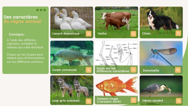 A l'aide des difféntes capsules, complète le tableau qui a été distribué. Clique sur les loupes pour obtenir plus d'informations sur les différents animaux.