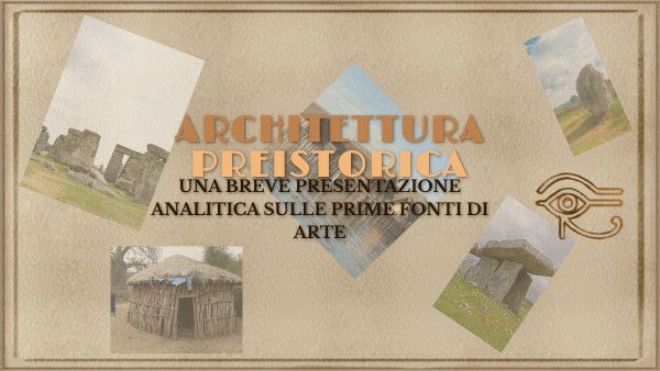 Presentazione sulle prime fonti di arte architettonica: opere in pietra quali menhir, dolmen, cromlech; opere lignee quali capanne e insediamenti terramare.