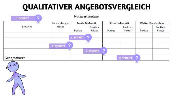 Addieren Sie alle Zahlen unter "Punkte x Faktor" und schreiben Sie das Ergebnis unten in die Zelle: Machen Sie das für alle drei Angebote. Je höher das Gesamtergebnis desto besser schneidet der Lieferant ab. Wählen Sie das Angebot mit dem höchsten Gesamtergebnis.