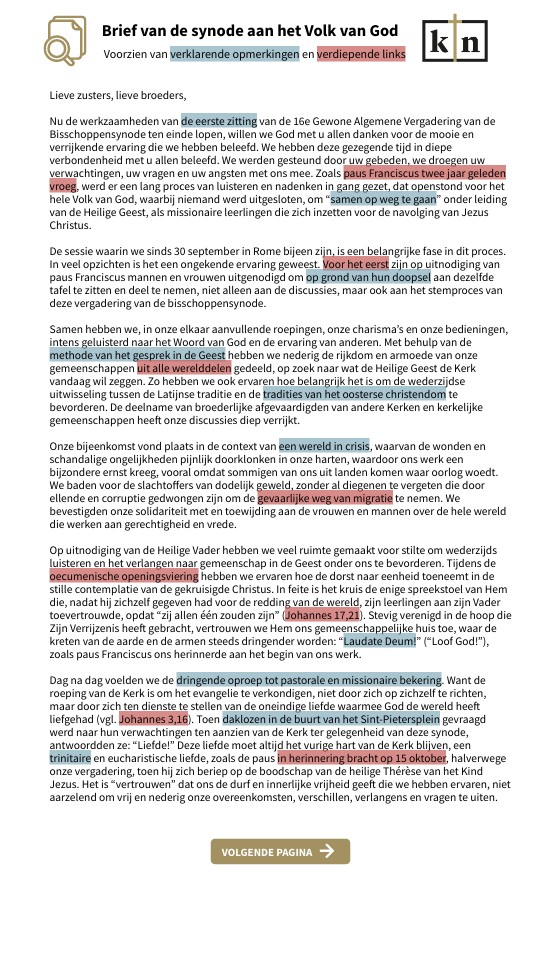 En nu? We hopen dat de maanden die leiden tot de tweede sessie in oktober 2024 iedereen in staat zullen stellen om concreet deel te nemen aan de dynamiek van missionaire gemeenschap die het woord “synode” aangeeft. Het gaat niet om ideologie, maar om een ervaring die geworteld is in de apostolische traditie. Zoals de paus ons aan het begin van dit proces in herinnering bracht, “lopen gemeenschap en missie het risico enigszins abstract te blijven, tenzij we een kerkelijke praxis cultiveren die de concreetheid van synodaliteit tot uitdrukking brengt (...) en echte betrokkenheid van iedereen aanmoedigt” (9 oktober 2021). Er zijn vele uitdagingen en talrijke vragen: het samenvattend verslag van de eerste sessie zal de punten van overeenstemming die we hebben bereikt specificeren, de open vragen benadrukken en aangeven hoe ons werk verder zal gaan. Om verder te komen in haar onderscheidingsvermogen moet de Kerk absoluut naar iedereen luisteren, te beginnen bij de armsten. Dit vereist een weg van bekering van haar kant, die ook een weg van lof is: “Ik prijs U Vader, Heer van hemel en aarde, omdat Gij deze dingen verborgen hebt voor wijzen en verstandigen, maar ze hebt geopenbaard aan kleinen” (Lucas 10,21)! Het betekent luisteren naar hen aan wie het recht op spreken in de samenleving is ontzegd of die zich buitengesloten voelen, zelfs door de Kerk; luisteren naar mensen die het slachtoffer zijn van racisme in al zijn vormen – in het bijzonder in sommige regio’s naar inheemse volken wier culturen zijn geminacht. Bovenal heeft de Kerk van onze tijd de plicht om in een geest van bekering te luisteren naar hen die het slachtoffer zijn geworden van misbruik door leden van de Kerk, en zich er concreet en structureel voor in te zetten dat dit niet meer gebeurt. De Kerk moet ook luisteren naar leken, vrouwen en mannen, die allen geroepen zijn tot heiligheid krachtens hun dooproeping: naar het getuigenis van catechisten, die in veel situaties de eerste verkondigers van het evangelie zijn; naar de eenvoud en levendigheid van kinderen, het enthousiasme van jongeren, naar hun vragen en hun smeekbeden; naar de dromen, de wijsheid en het geheugen van ouderen. De Kerk moet luisteren naar gezinnen, naar hun opvoedkundige zorgen, naar het christelijk getuigenis dat zij afleggen in de wereld van vandaag. Ze moet de stem verwelkomen van hen die betrokken willen zijn bij lekenbedieningen en willen deelnemen aan besluitvormingsstructuren. Om verder te komen in het synodale beraad moet de Kerk vooral nog meer de woorden en ervaringen van de gewijde bedienaren verzamelen: priesters, de voornaamste medewerkers van de bisschoppen, wier sacramentele bediening onmisbaar is voor het leven van het hele lichaam; diakens, die door hun ambt de zorg van de hele Kerk voor de meest kwetsbaren betekenen. Ze moet zich ook laten ondervragen door de profetische stem van het godgewijde leven, de waakzame wachter van de roep van de Geest. Zij moet ook aandacht hebben voor allen die haar geloof niet delen, maar op zoek zijn naar de waarheid, en in wie de Geest, die “allen de mogelijkheden biedt om in dit Paasgeheim te worden opgenomen” (Gaudium et Spes 22), ook aanwezig en werkzaam is. “De wereld waarin we leven, en die we geroepen zijn lief te hebben en te dienen, zelfs met haar tegenstellingen, vereist dat de Kerk de samenwerking versterkt in alle gebieden van haar missie. Juist dit pad van synodaliteit verwacht God van de Kerk van het derde millennium.” (Paus Franciscus, 17 oktober 2015). We hoeven niet bang te zijn om gehoor te geven aan deze oproep. Maria, Moeder van de Kerk, de eerste op de reis, begeleidt onze pelgrimstocht. In vreugde en verdriet toont ze ons haar Zoon en nodigt ze ons uit om te vertrouwen. En Hij, Jezus, is onze enige hoop! Vaticaanstad, 25 oktober 2023 Vertaling & kanttekeningen: Anton de Wit, Katholiek Nieuwsblad