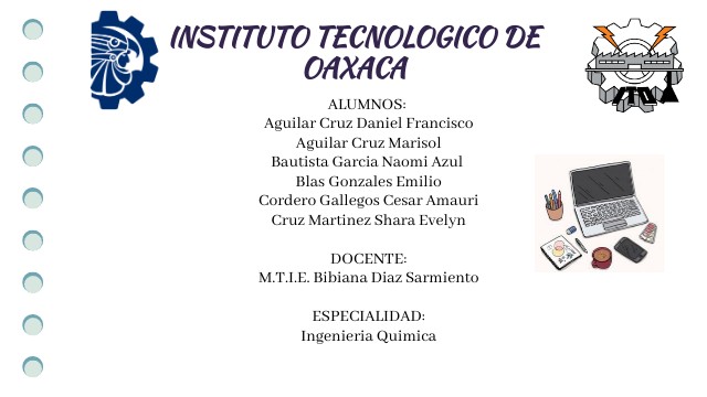 ALUMNOS: Aguilar Cruz Daniel FranciscoAguilar Cruz Marisol Bautista Garcia Naomi Azul Blas Gonzales Emilio Cordero Gallegos Cesar Amauri Cruz Martinez Shara Evelyn DOCENTE: M.T.I.E. Bibiana Diaz Sarmiento ESPECIALIDAD: Ingenieria Quimica