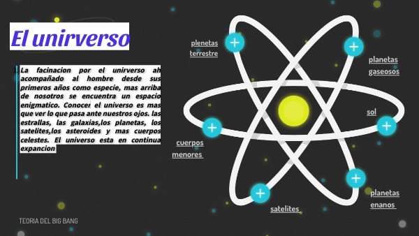 - La facinacion por el unirverso ah acompañado al hombre desde sus primeros años como especie, mas arriba de nosotros se encuentra un espacio enigmatico. Conocer el universo es mas que ver lo que pasa ante nuestros ojos. las estrallas, las galaxias,los planetas, los satelites,los asteroides y mas cuerpos celestes. El universo esta en continua expancion