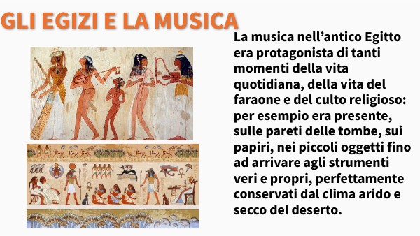 La musica nell’antico Egitto era protagonista di tanti momenti della vita quotidiana, della vita del faraone e del culto religioso: per esempio era presente, sulle pareti delle tombe, sui papiri, nei piccoli oggetti fino ad arrivare agli strumenti veri e propri, perfettamente conservati dal clima arido e secco del deserto.