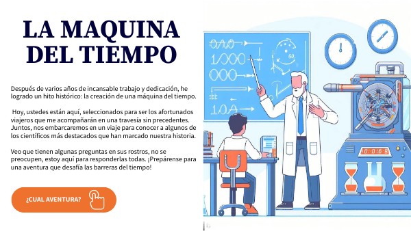 Después de varios años de incansable trabajo y dedicación, he logrado un hito histórico: la creación de una máquina del tiempo. Hoy, ustedes están aquí, seleccionados para ser los afortunados viajeros que me acompañarán en una travesía sin precedentes. Juntos, nos embarcaremos en un viaje para conocer a algunos de los científicos más destacados que han marcado nuestra historia. Veo que tienen algunas preguntas en sus rostros, no se preocupen, estoy aquí para responderlas todas. ¡Prepárense para una aventura que desafía las barreras del tiempo!