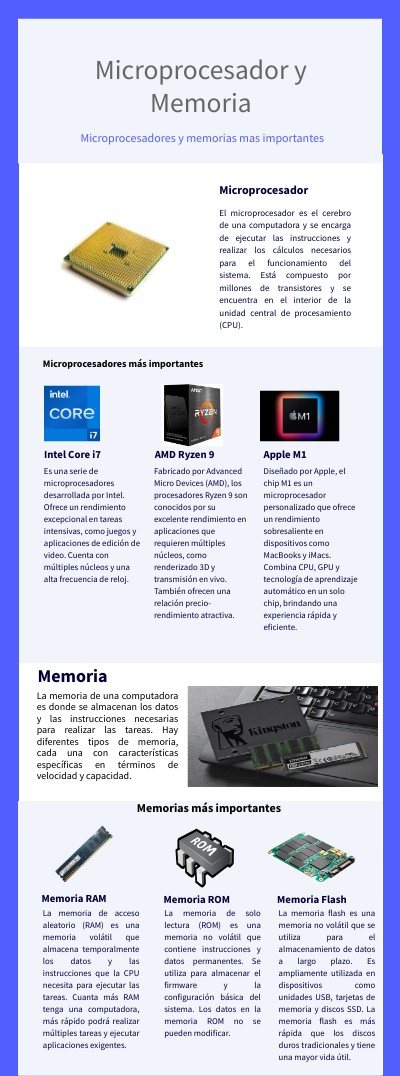 La memoria de una computadora es donde se almacenan los datos y las instrucciones necesarias para realizar las tareas. Hay diferentes tipos de memoria, cada una con características específicas en términos de velocidad y capacidad.