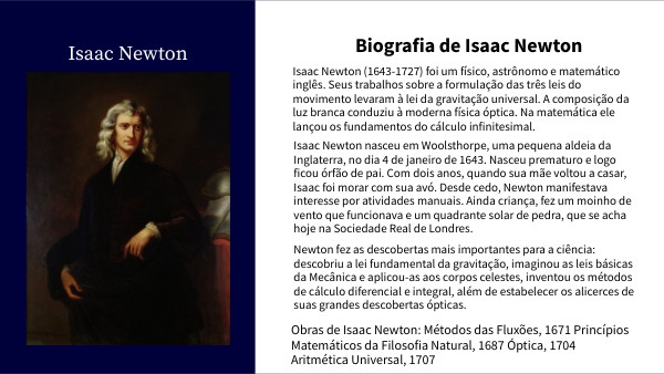 Isaac Newton (1643-1727) foi um físico, astrônomo e matemático inglês. Seus trabalhos sobre a formulação das três leis do movimento levaram à lei da gravitação universal. A composição da luz branca conduziu à moderna física óptica. Na matemática ele lançou os fundamentos do cálculo infinitesimal.
