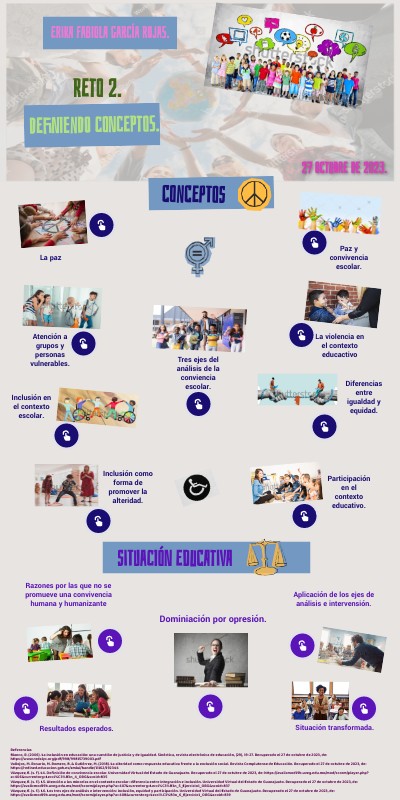 ReferenciasBlanco, R. (2006). La inclusión en educación: una cuestión de justicia y de igualdad. Sinéctica, revista electrónica de educación, (29), 19-27. Recuperado el 27 de octubre de 2023, de: https://www.redalyc.org/pdf/998/99815739003.pdf Vallejos, M. Rosario, M. Romero, B. & Gutiérrez, M. (2018). La alteridad como respuesta educativa frente a la exclusión social. Revista Complutense de Educación. Recuperado el 27 de octubre de 2023, de: https://redined.educacion.gob.es/xmlui/handle/11162/192344 Vázquez, E. (s. f). L4. Definición de convivencia escolar. Universidad Virtual del Estado de Guanajuato. Recuperado el 27 de octubre de 2023, de: https://avalicmod19b.uveg.edu.mx/mod/scorm/player.php?a=406¤torg=Lecci%C3%B3n_4_ORG&scoid=835 Vázquez, E. (s. f.). L5. Atención a las minorías en el contexto escolar: diferencia entre integración e inclusión. Universidad Virtual del Estado de Guanajuato. Recuperado el 27 de octubre de 2023, de: https://avalicmod19b.uveg.edu.mx/mod/scorm/player.php?a=407¤torg=Lecci%C3%B3n_5_Ejercicio1_ORG&scoid=837 Vázquez, E. (s. f.). L6. Los tres ejes de análisis e intervención: inclusión, equidad y participación. Universidad Virtual del Estado de Guanajuato. Recuperado el 27 de octubre de 2023, de: https://avalicmod19b.uveg.edu.mx/mod/scorm/player.php?a=408¤torg=Lecci%C3%B3n_6_Ejercicio1_ORG&scoid=839