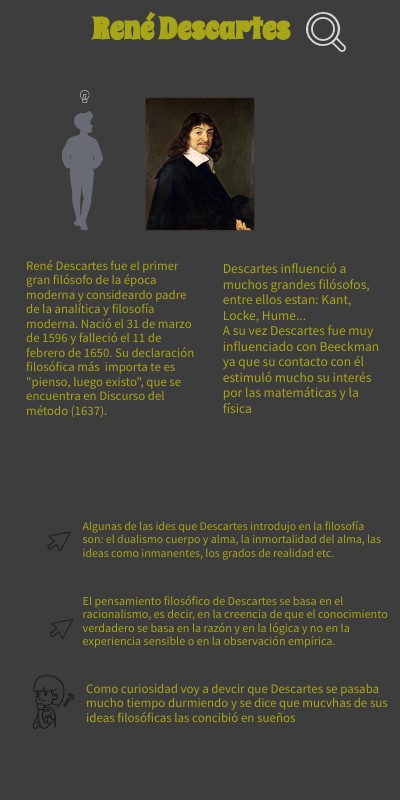 René Descartes fue el primer gran filósofo de la época moderna y consideardo padre de la analítica y filosofía moderna. Nació el 31 de marzo de 1596 y falleció el 11 de febrero de 1650. Su declaración filosófica más importa te es "pienso, luego existo", que se encuentra en Discurso del método (1637).