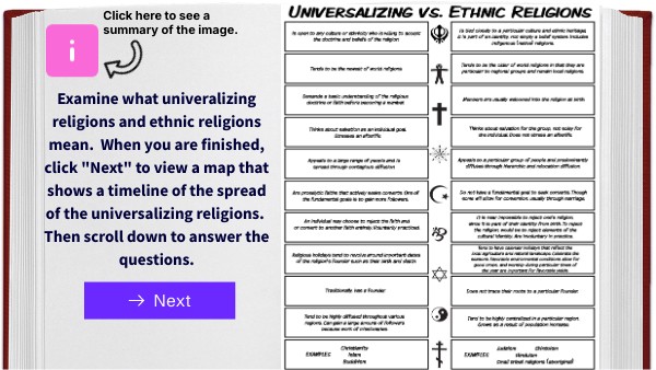 Examine what univeralizing religions and ethnic religions mean. When you are finished, click "Next" to view a map that shows a timeline of the spread of the universalizing religions. Then scroll down to answer the questions.