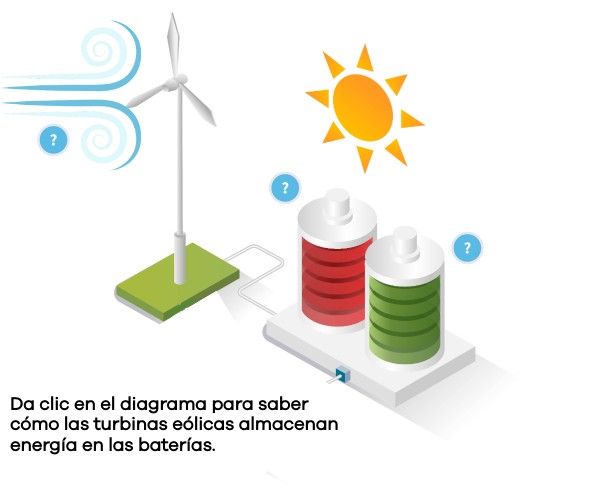 Da clic en el diagrama para saber cómo las turbinas eólicas almacenan energía en las baterías.