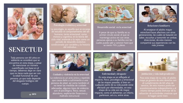 En esta etapa se ve reflejado el impacto, físico, psicológico y emocional de las etapas pasadas. si bien en cualquier parte de su vida puede verse afectado por efermedades, en esta etapa de su vida son de mayor impacto, como el alzheimer, un infarto, parkinson, artritis, entre otras.