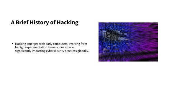 - Hacking emerged with early computers, evolving from benign experimentation to malicious attacks, significantly impacting cybersecurity practices globally.