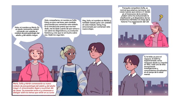 María, Sofía y Adrián comenzarán su nuevo módulo de psicopatología del adulto y del adulto mayor v1, emocionados, llegan a su primer día de clases. Se presentan entre sí y comienzan a dialogar sobre los temas que verán en su curso.