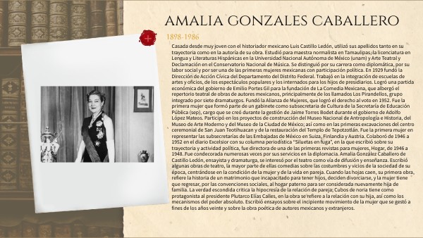 Casada desde muy joven con el historiador mexicano Luis Castillo Ledón, utilizó sus apellidos tanto en su trayectoria como en la autoría de su obra. Estudió para maestra normalista en Tamaulipas, la licenciatura en Lengua y Literaturas Hispánicas en la Universidad Nacional Autónoma de México (unam) y Arte Teatral y Declamación en el Conservatorio Nacional de Música. Se distinguió por su carrera como diplomática, por su labor social y por ser una de las primeras mujeres mexicanas con participación política. En 1929 fundó la Dirección de Acción Cívica del Departamento del Distrito Federal. Trabajó en la integración de escuelas de artes y oficios, de los espectáculos populares y los internados para los hijos de presidiarios. Logró una partida económica del gobierno de Emilio Portes Gil para la fundación de La Comedia Mexicana, que albergó el repertorio teatral de obras de autores mexicanos, principalmente de los llamados Los Pirandellos, grupo integrado por siete dramaturgos. Fundó la Alianza de Mujeres, que logró el derecho al voto en 1952. Fue la primera mujer que formó parte de un gabinete como subsecretaria de Cultura de la Secretaría de Educación Pública (sep), cargo que se creó durante la gestión de Jaime Torres Bodet durante el gobierno de Adolfo López Mateos. Participó en los proyectos de construcción del Museo Nacional de Antropología e Historia, del Museo de Arte Moderno y del Museo de la Ciudad de México; así como en las primeras excavaciones del centro ceremonial de San Juan Teotihuacan y de la restauración del Templo de Tepotzotlán. Fue la primera mujer en representar las subsecretarías de las Embajadas de México en Suiza, Finlandia y Austria. Colaboró de 1946 a 1952 en el diario Excelsior con su columna periodística “Siluetas en fuga”, en la que escribió sobre su trayectoria y actividad política, fue directora de una de las primeras revistas para mujeres, Hogar, de 1946 a 1948. Fue condecorada numerosas veces por sus servicios en la diplomacia. Amalia González Caballero de Castillo Ledón, ensayista y dramaturga, se interesó por el teatro como vía de difusión y enseñanza. Escribió algunas obras de teatro, la mayor parte de ellas comedias sobre las costumbres y vicios de la sociedad de su época, centrándose en la condición de la mujer y de la vida en pareja. Cuando las hojas caen, su primera obra, refiere la historia de un matrimonio que incapacitado para tener hijos, deciden divorciarse, y la mujer tiene que regresar, por las convenciones sociales, al hogar paterno para ser considerada nuevamente hija de familia. La verdad escondida critica la hipocresía de la relación de pareja; Cubos de noria tiene como protagonista al presidente Plutarco Elías Calles, en la obra se refiere a la relación con su hija, así como los mecanismos del poder absoluto. Escribió ensayos sobre el incipiente movimiento de la mujer que se gestó a fines de los años veinte y sobre la obra poética de autores mexicanos y extranjeros.