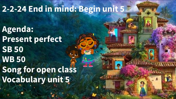 2-2-24 End in mind: Begin unit 5 Agenda: Present perfect SB 50 WB 50 Song for open class Vocabulary unit 5