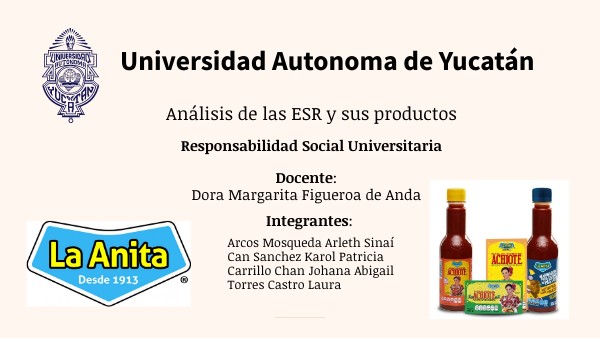 La Anita tiene el propósito de ofrecer los mejores condimentos y salsas a sus consumidores, gracias a un personal capacitado, motivado y comprometido. Esta empresa con una gran presencia a nivel nacional, que busca posicionarse también en un mercado internacional, así como tambien se encarga de comprometerse en cuidado del medio ambiente y a la sociedad, creando envases reciclables, usando energias renovables, generando empleo local y financiando a trabajadores y estudiantes.