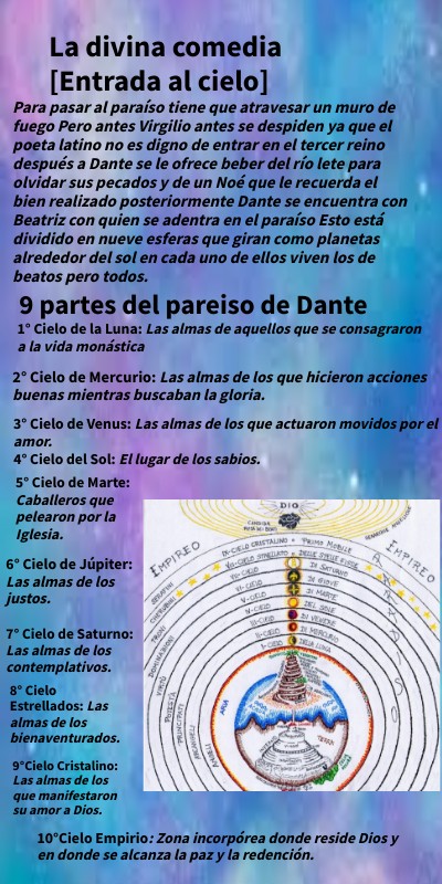 Para pasar al paraíso tiene que atravesar un muro de fuego Pero antes Virgilio antes se despiden ya que el poeta latino no es digno de entrar en el tercer reino después a Dante se le ofrece beber del río lete para olvidar sus pecados y de un Noé que le recuerda el bien realizado posteriormente Dante se encuentra con Beatriz con quien se adentra en el paraíso Esto está dividido en nueve esferas que giran como planetas alrededor del sol en cada uno de ellos viven los de beatos pero todos.