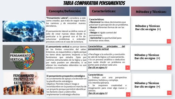 Características principales del pensamiento vertical • Para llegar a la solución y conclusión se vale de la lógica y el razonamiento. • Es un proceso analítico o deductivo que suele dividir un problema en partes para analizar cada uno. Dar clic en signo (+)