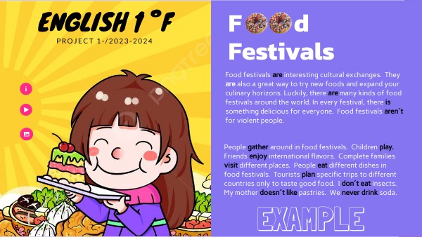 People gather around in food festivals. Children play. Friends enjoy international flavors. Complete families visit different places. People eat different dishes in food festivals. Tourists plan specific trips to different countries only to taste good food. I don´t eat insects. My mother doesn´t like pastries. We never drink soda.