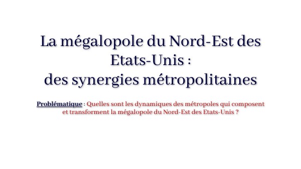 Mégalopole du Nord-Est des Etats-Unis = aux Etats-Unis et s'étend sur 800 km D'après Jean Gottman (géographe) -> concept MEGALOPOLIS en 1960 -> ensemble des villes multimillionnaires de la côte Est des E-U Grandes métropoles : Boston, Washington, New-York, Baltimore et Philadelphie