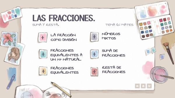 Fracciones equivalentes a la unidad, fracciones equivalentes, números mixtos, suma y resta de fracciones con el mismo denominador.