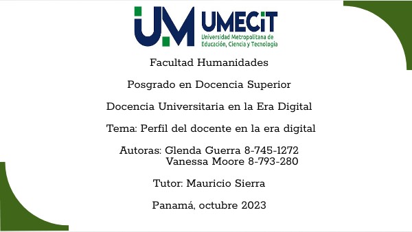 Facultad Humanidades Posgrado en Docencia Superior Docencia Universitaria en la Era Digital Tema: Perfil del docente en la era digital Autoras: Glenda Guerra 8-745-1272 Vanessa Moore 8-793-280 Tutor: Mauricio Sierra Panamá, octubre 2023