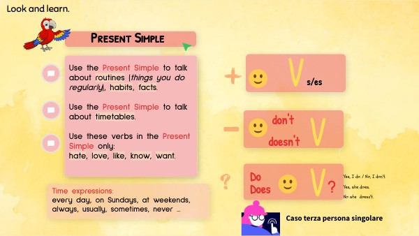 Queste tre regole vanno utilizzate quando è presente la terza persona singolare. La terza persona singolare può essere presentato con: -PRONOMI PERSONALI: "he, she, it" -NOME PROPRIO di persona, animale, città: " Anna, Caroline, Fido, London..." - Quando è presente THE + NOME COMUNE SINGOLARE:"The mom, the child, the car, the air pods