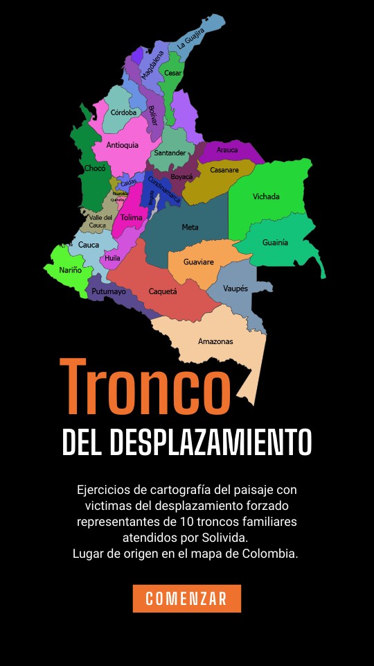 Ejercicios de cartografía del paisaje con victimas del desplazamiento forzado representantes de 10 troncos familiares atendidos por Solivida. Lugar de origen en el mapa de Colombia.