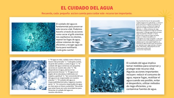 El cuidado del agua es fundamental para preservar este recurso vital. Podemos hacerlo a través de acciones como cerrar el grifo mientras nos cepillamos los dientes, reparar las fugas de agua, utilizar sistemas de riego eficientes y recoger agua de lluvia para reutilizarla. ¡Cada gota cuenta!