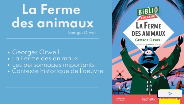 George Orwell et La Ferme des animaux En 1943, George Orwell quitte son emploi à la BBC pour écrire "La Ferme des animaux", apologue publié en 1945. Son titre original est "Animal Farm, A Fairy Story". Le roman est court, seulement une dizaine de chapitres, mais c'est une satire brillante du stalinisme et des régimes autoritaires. Le récit rend compte de la révolte des animaux d'une ferme qui prennent le pouvoir et chassent les hommes. Fable animalière, c'est aussi une dystopie, où le principe de contre-utopie est très présent. Ce roman est en fait la critique de la Révolution russe de 1917 et du régime soviétique qui s'est installé à sa suite. George Orwell en profite pour fustiger tous les totalitarismes autoritaires. Il dresse un système tellement proche de la réalité que certains intellectuels vivant le régime de Staline témoignent de la justesse de cette fable.