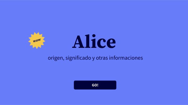 Alice, en espanol Alicia, es un nombre femenino de origen griego "Alétheia" es decir la verdad (persona sincera, real, verdadera). Es un adaptamiento del nombre Adelaide de origen celto-germanica que significa noble y guapa