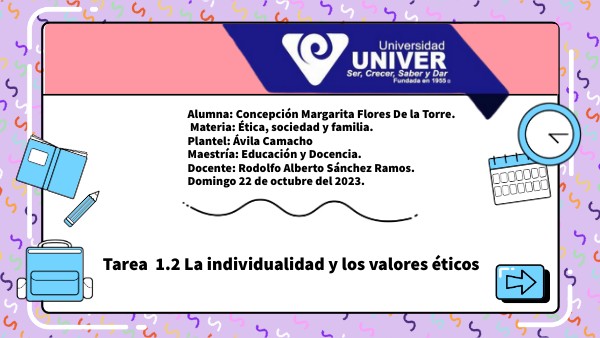 Alumna: Concepción Margarita Flores De la Torre. Materia: Ética, sociedad y familia. Plantel: Ávila Camacho Maestría: Educación y Docencia. Docente: Rodolfo Alberto Sánchez Ramos. Domingo 22 de octubre del 2023.
