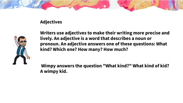 Adjectives Writers use adjectives to make their writing more precise and lively. An adjective is a word that describes a noun or pronoun. An adjective answers one of these questions: What kind? Which one? How many? How much? Wimpy answers the question "What kind?" What kind of kid? A wimpy kid.